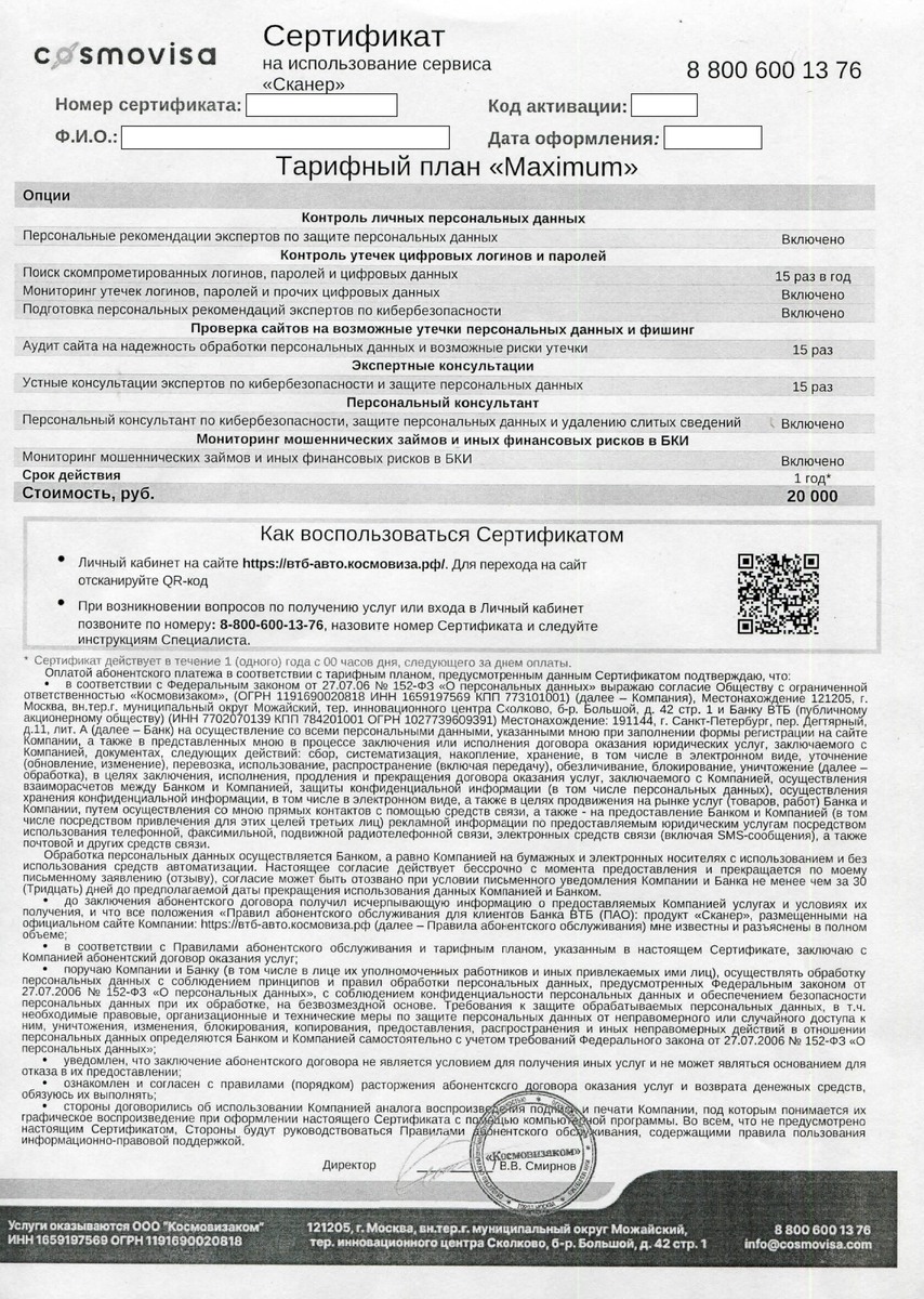 Клиенту выдается Сертификат. В данном случае стоимость сертификата составила 20 000 рублей. В Сертификате указан тарифный план и перечень различных услуг. Безусловное право на отказ от любых услуг устанавливает ст. 32 Закона «О защите прав потребителей». Также данное право установлено ст. 7 Закона «О потребительском кредите» Начать процесс по возврату денежных средств нужно как можно раньше, в идеале в течение 30 дней с момента подписания договора.