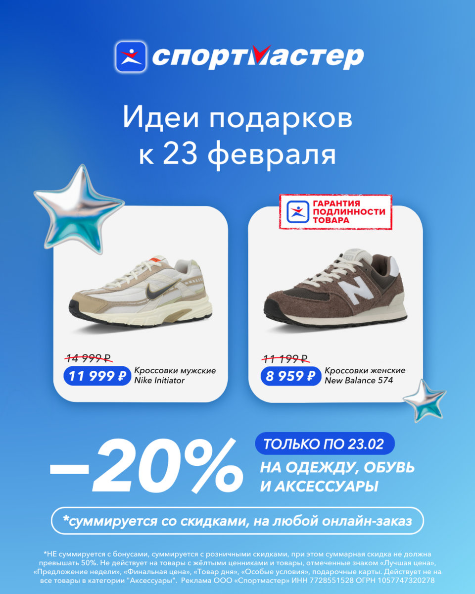 Соберите подарок к 23 Февраля в Спортмастере! Для тех, кто еще не подготовился к мужскому празднику, есть рабочая идея. И это не бритвенный станок, и не дезодорант. В Спортмастере крутые скидки и много классных вещей. Забирайте промокод для выгодного заказа ОНЛАЙН: 🔥 СМПР38341 – скидка 20% на одежду, обувь и аксессуары. Действует до 23 февраля.