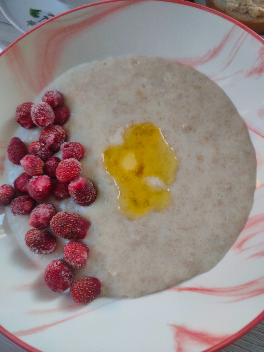 Всем привет! С вами Надежда и сегодня я хочу предложить вашему вниманию идею нашего меню, которое не отнимет у вас много времени на приготовление. Ну вот, уже и наступила пятница. С утра настроение солнечное, да и как ему не быть солнечным, если всю эту неделю я не видела солнышка, так как ко мне оно в кабинет не заглядывает, а вот сегодня с утра солнышко светит. Да и выходной у меня сегодня. Отоспалась за два последних дня, в которые спала по 3 - 4 часа из - за курсов. Встала довольно поздно, надо готовить завтрак. На неделе не ели кашу, так что сегодня варю овсяную молочную кашу. Ели ее с топленым маслом и замороженными ягодами земклуники. Кстати, овсяную кашу я варю долгой варки, но предварительно размалываю ее в муку крупного помола на блендере. Черный натуральный кофе, к кофе шоколадная конфета Тирамису и бутерброд с намазкой из горбуши и скумбрии. Быстрый и вкусный завтрак за 15 минут. В магазин я сегодня не иду, решила устроить выходной от магазина, да и ничего нам не надо все