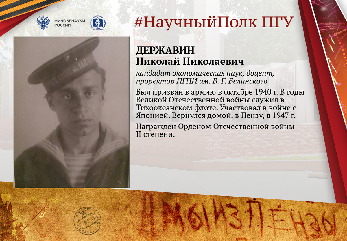 Николай Николаевич Державин — человек, чья жизнь тесно переплелась с судьбой страны в период Великой Отечественной войны и последующего послевоенного восстановления. Родившись 15 июня 1922 года в городе Керенске (ныне Пензенская область), он был призван в ряды Красной Армии 24 октября 1940 года в Пензе. Его военная служба проходила в составе 3-го запасного экипажа Тихоокеанского морского флота. Запись «Старшина 1 статьи / моряк» указывает на его особый статус и личные качеств. Тихоокеанский флот СССР во время Второй мировой войны находился в постоянной боевой готовности. Главные задачи флота состояли в обороне побережья, защите своих путей сообщения на море, в нарушении морских коммуникаций противника (в случае нападения Японии), организации противодесантной обороны берегов. Участие в войне с Японией является еще одним значимым фактом биографии Николая Державина. Окончание службы в 1947 году позволило ему вернуться к мирной жизни и посвятить себя образованию. После демобилиза