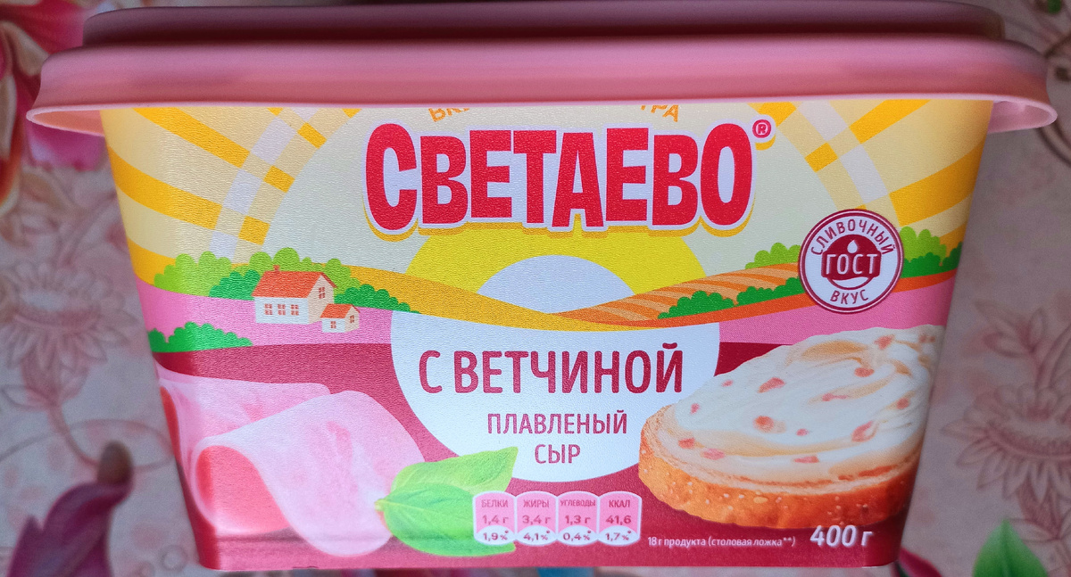 Сыр Светаево плавленный с ветчиной 50% жирности, 400 грамм, цена без скидки - 199 рублей.
