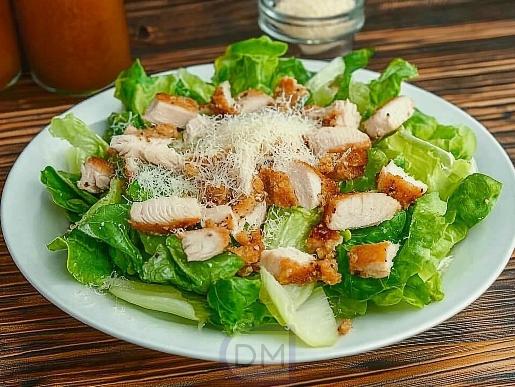 - В миске соедините листья салата, курицу и тертый пармезан.
