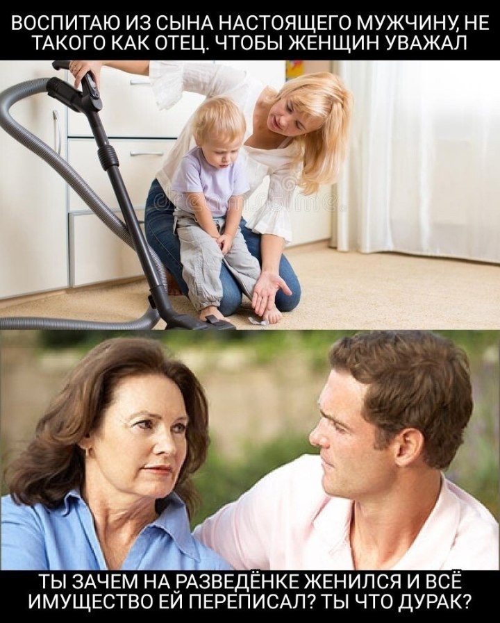 С самого детства мальчики слышат отовсюду о том, что девочкам нужно уступать, девочек нельзя обижать.. Что воспитаешь, то и вырастет. Вырастают потом эти мальчики и уступают девочкам свои квартиры и имущество, оставаясь ни с чем, кроме алиментов, разбитого сердца и выжженной души.. Сына нужно воспитывать так, чтобы думал в первую очередь о своих интересах, добивался успеха в жизни, самореализовывался и был счастлив, а не жертвовал собой, уступая девочкам. Девочки всё равно этих жертв не оценят. А когда будет успех во всех сферах, тогда сам любую девочку сможет выбрать. Сами будут искать возможности быть с ним. Все его будут. И вот тут главное не потерять голову, иначе всё достигнутое ранее может сойти на нет. Женщины и деньги всегда в одном кругу. Появились деньги - появились женщины. Появились женщины - пропали деньги. Пропали деньги - пропали женщины. Пропали женщины - появились деньги. Уберите из этого круга женщин и у вас будет много денег. Непонимание этого погубило очень