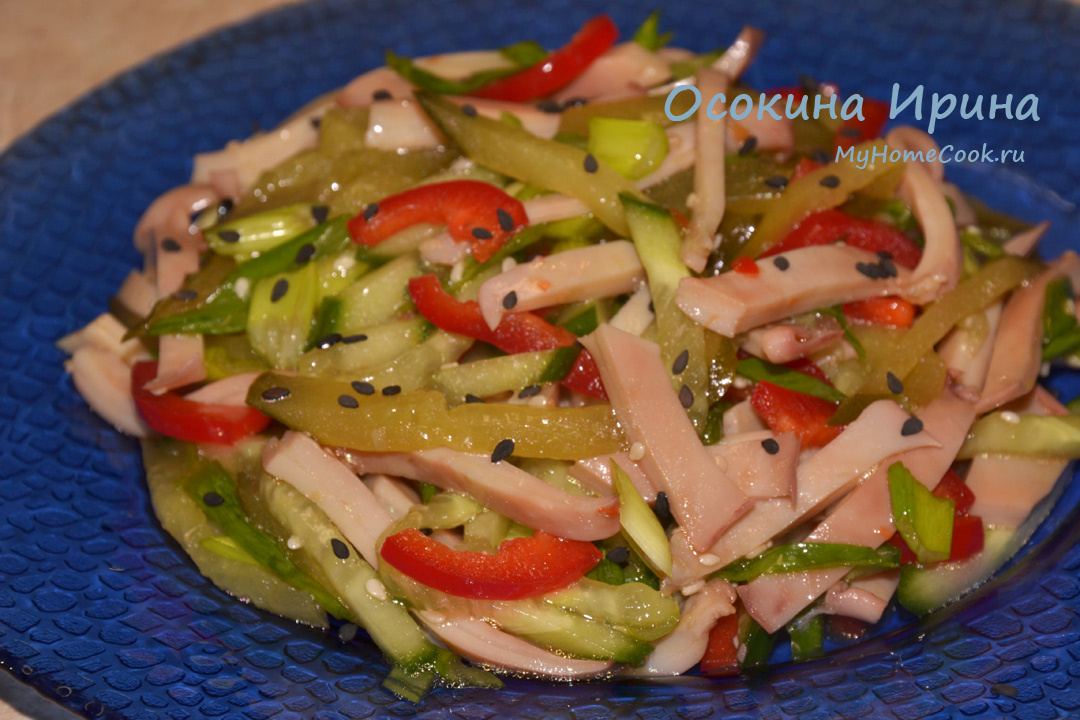 Сегодня решила приготовить салат из кальмаров, вариантов много, сегодня у меня такой: порезала брусочком 2 отварных кальмара, 1 свежий огурец, 2 маринованных огурца и половину красного сладкого перца, добавила хорошую горсть резаного зелёного лука и промешала. Для заправки в пиалке смешала 1 ст.л. соевого соуса, 1 дес.л. кунжутного масла, 1 ст.л. оливкового масла, 1 дес.л. сладкого соуса чили и 1 ч.л. лимонного сока, подвзбила до состояния эмульсии и заправила салат, добавила 1 ст.л. кунжута, промешала, немного настояла и подала. Сочно, вкусно и пикантненько) Приятного аппетита
