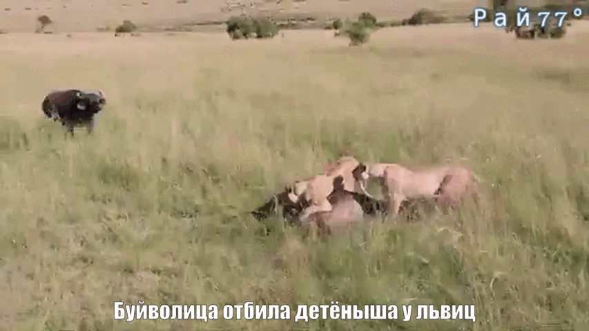 Путешественник, проводивший свой досуг в природном заповеднике Маcаи-Мара, расположенном в Кении, стал очевидцем противостояния хищников за добычу. Судя по кадрам, предоставленной Рай77° видеозаписи, хищные кошки атаковали оставшегося без присмотра детёныша буйвола. Пробегавшая мимо гиена была настолько голодна, что попыталась отнять добычу у львиц, но в конечном итоге вынуждена была отступить и оставить хищниц наедине с жертвой. Но через некоторое время несколько кошкообразных вернулись, чтобы испытать удачу, но не смогли противостоять грозным конкурентам. Турист продолжал запечатлевать трапезу львиц, когда на горизонте появилась парнокопытная мамаша и отбила у хищных зверей своего детёныша, который получил серьёзные травмы, но самостоятельно покинул ставшее ненавистным поле и воссоединился со своим стадом. »»ВИДЕО«« Тем временем: буйволы отбили своего детёныша у голодной львицы в Ботсване