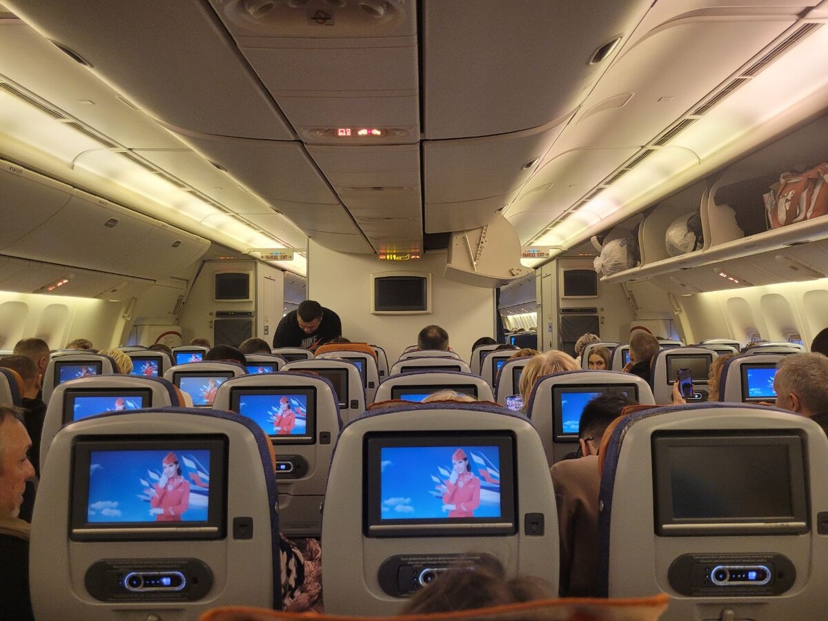Тур в Шарм-Эль-Шейх я купила с вылетом туда и обратно авиакомпанией "Аэрофлот". Это был чартерный рейс, перевозивший из Москвы туристов туроператора "Библио-Глобус". Ручную кладь на рейс можно было взять до 10 кг, багаж - 23 кг. Рассказываю, чем кормили на рейсе, и что сильно отличалось в полете в Египет и обратно. Рейс из Москвы был на громадном Боинге с 3 рядами кресел, предназначенном для длительных международных полетов. Все кресла были оснащены индивидуальными медиасистемами, чтобы пассажиры во время полета могли смотреть фильмы, телепередачи, слушать музыку или аудиокнигу. Правда, не все из таких медиасистем работали:) В моем ряду (я сидела посередине салона) на всех впереди стоящих креслах медиасистемы не функционировали. Еще, из хорошего, на каждом сидении лежал пакет с одноразовыми тапочками. Теперь о питании. Вначале бортпроводники разнесли прохладительные напитки: колу, спрайт, воду с газом и без, а также соки (яблочный, апельсиновый и томатный). Можно, при желании, брать ср