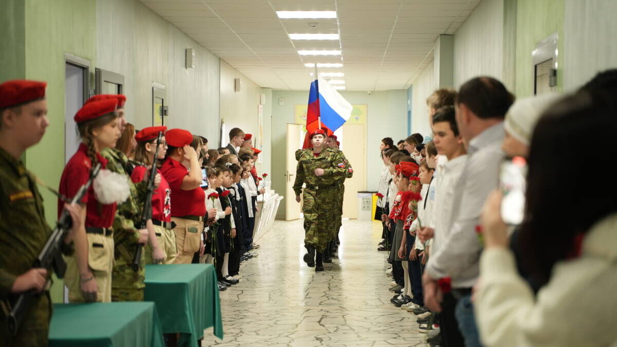 Открытие парт Героев началось с выноса госфлагов РФ, РТ, знамени школы и флага Юнармии.