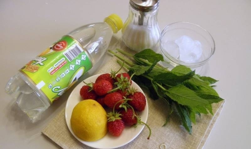 Подготовьте для мохито все ингредиенты. Воду или спрайт заранее охладите. Тщательно вымойте мяту и клубнику.