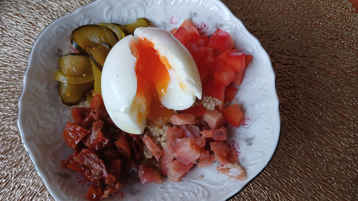 На завтрак боул с киноа. Обычно боул в среду делаем, но на этой неделе подвинула на один день. Боул: основа - киноа, плюс яйцо, болгарский перец, горбуша, огурчики как в Маке, вяленые помидоры К боулу - бутеброд с запеченной индейкой и кофе с конфеткой На обед доели суп куриный с фунчозой, делала салат из моркови с плавленым сыром, яйцом и чесноком (водоросли забыла в суп положить, кладу их уже при подаче) и на десерт мандарин, кофе и пряник Оладьи решила пожарить, немного, чисто чай попить. Делала на кефире, без яиц. Вкусные, пышные, ели их с абрикосовым джемом. Первая партия готова 👌 На ужин спагетти с мидиями в сливочном соусе и салат коулслоу (с ананасами) плюс оладьи к чаю мидии из Вкусвилл, сливки 20% для соуса, посыпала пармезаном Меню год назад