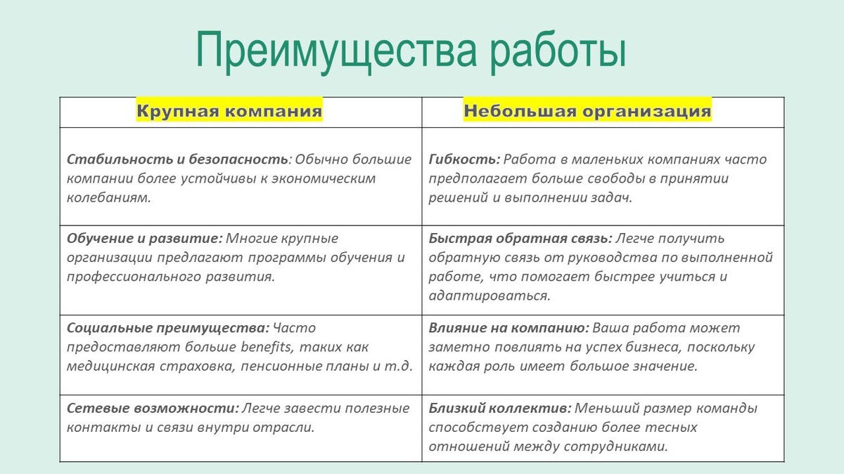 Вот такой комментарий я иногда получаю от кандидатов. 🤔 ❓Так что же лучше: работать в крупной компании или сделать выбор в пользу небольшой организации? Предлагаю рассмотреть вопрос с позиции сравнения. 1️⃣Структура и организация. Для крупной корпорации свойственна четкая иерархия с несколькими уровнями управления и наличие специализированных отделов. Все процессы более формализованы и регламентированы. В маленькой компании структура более плоская (например, один человек может выполнять несколько ролей). Больше свободы в принятие решений. Больше творчества. 2️⃣Карьерные возможности. В большой компании четко определенные карьерные пути и программы наставничества. Есть больше возможностей для вертикального и горизонтального роста благодаря большому числу позиций. Однако, в небольшой организации есть возможность быстрого принятия на себя новых задач и проектов. Как правило, ты выступаешь сразу в нескольких ролях, тем самым, "прокачиваясь" в каких-то смежных функциях. 3️⃣ Культура в компа
