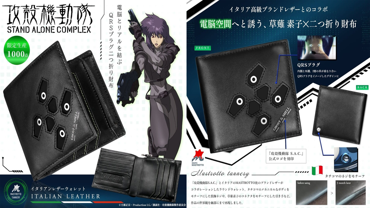 Дизайн всех новых продуктов строгий, ведь аниме Ghost in the Shell Stand Alone Complex уже больше 20 лет и фанаты его тоже повзрослели за это время. Изделия из кожи высокого качества, а часы - швейцарские. Надеюсь, вам понравятся.