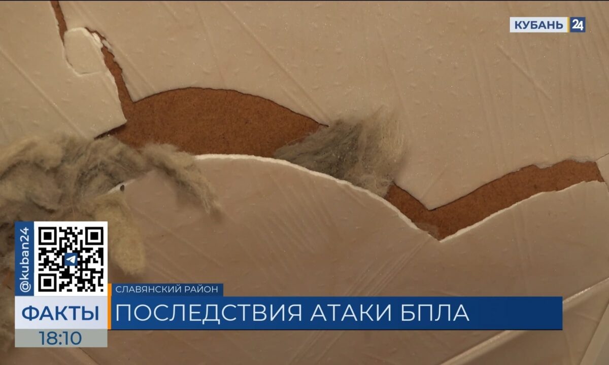 Видео канала «Кубань 24» Один из обломков БПЛА повредил кровлю дома Александры Шляхтовой. Вместе с супругом она прожила в нем 25 лет. Пенсионеры вели хозяйство и заботились о своем жилище. Во время атаки занимались домашними делами, от которых отвлек шум. «Вчера вечером что-то такое загудело, стукнуло, бухнуло. Муж был на улице, управлялся там по хозяйству, я была в другой комнате, так что мы не пострадали», — говорит Шляхтова. Теперь пенсионеров ждет ремонт коридора и кровли. Среди пострадавших зданий — хозпостройка, здесь повреждена крыша, выбило окна. Хозяин уже вызвал бригаду, чтобы восстановить помещение и очистить двор. По его словам, обломок дрона также зацепил провода, соседний дом был обесточен. Местные власти помогут всем пострадавшим. «На месте работают специальные службы. В Славянске-на-Кубани продолжает действовать режим локальной ЧС, специальные комиссии в ближайшее время оценят нанесенный ущерб, чтобы оказать жителям помощь в восстановлении имущества», — сообщает операти