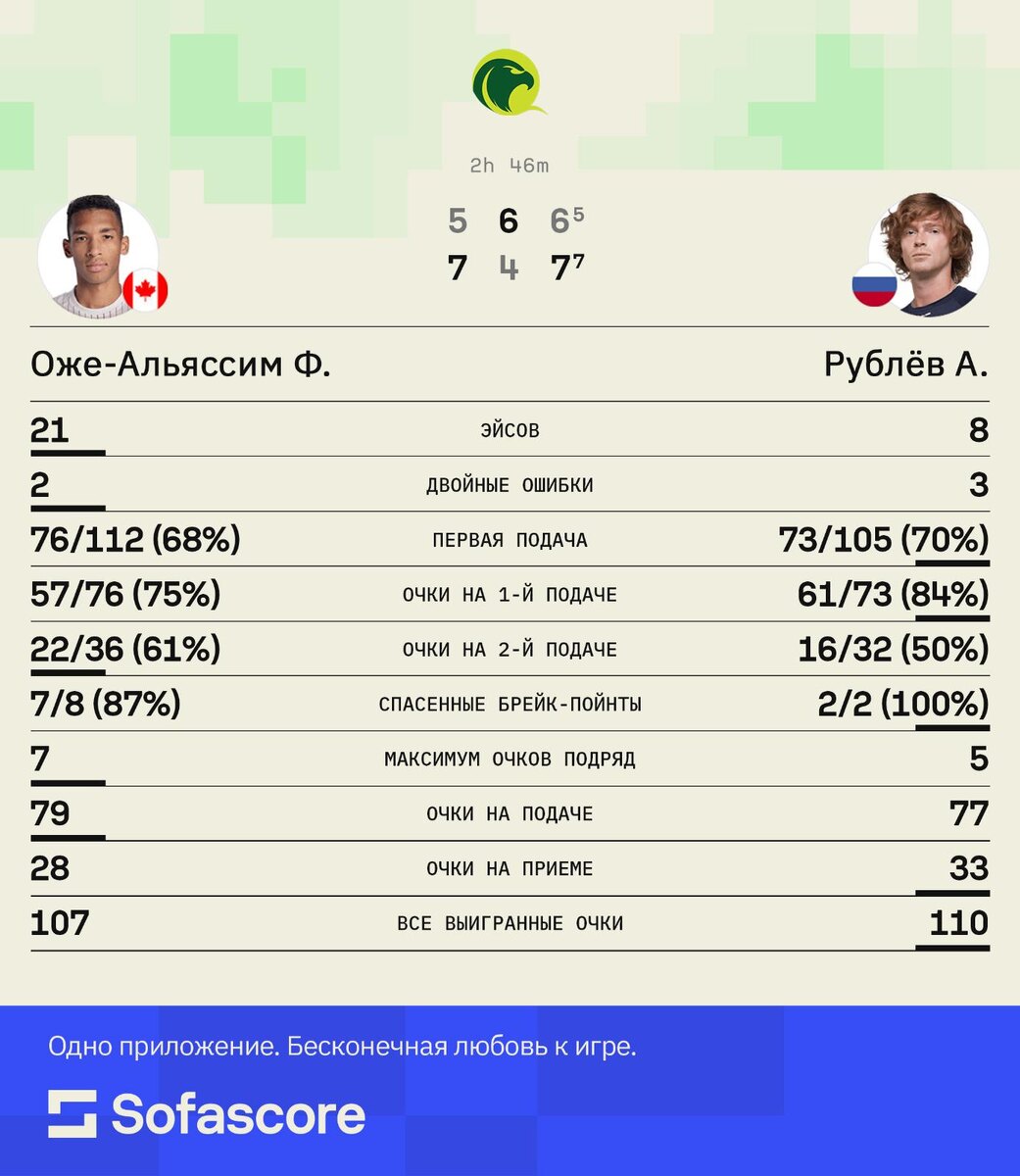 Российский теннисист Андрей Рублев вышел в финал турнира категории ATP 500 в Дохе. В 1/2 финала 27-летний россиянин, посеянный на турнире под пятым номером, победил канадца Феликса Оже-Альяссима, 23-ю ракетку мира, со счетом 7:5, 4:6, 7:6 (7:5). В личных встречах Рублева и канадца счет стал 6:1 в пользу россиянина, в том числе он побеждал в прошлом году в финале «Мастерса» в Мадриде. В решающем матче Рублев сыграет с победителем пары Иржи Легечка (Чехия, 25-й номер рейтинга ATP) — Джек Дрейпер (Великобритания, 16). Рублев занимает десятое место в мировом рейтинге, на его счету 16 титулов ATP. Турнир в Дохе с призовым фондом более $3 млн завершится 22 февраля. Обсудите новость в телеграм-канале «РБК Спорт». Sofascore