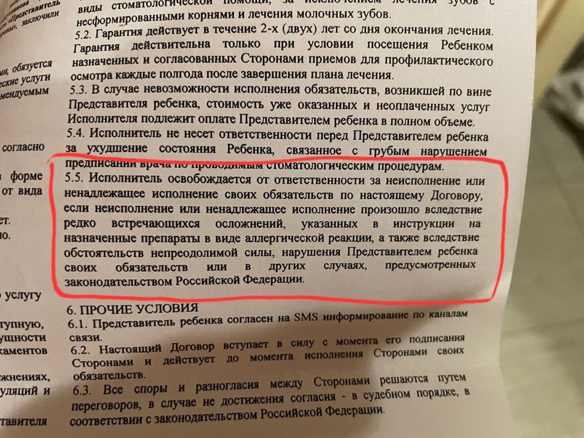 Доброе утро всем! Недавно моя подруга, которая также является моей коллегой, поделилась со мной частью договора со стоматологической клиникой, расположенной рядом с нашим домом. Особое внимание привлек пункт 5.5: "5.5. Исполнитель освобождается от ответственности за неисполнение или ненадлежащее исполнение своих обязательств по настоящему Договору, если неисполнение или ненадлежащее исполнение произошло вследствие редко встречающихся осложнений, указанных в инструкции на назначенные препараты, в виде аллергической реакции, а также вследствие обстоятельств непреодолимой силы, нарушения Представителем ребенка своих обязательств или в других случаях, предусмотренных законодательством Российской Федерации." Другими словами, если у ребёнка разовьётся анафилактический шок, клиника не будет нести ответственность за неправильное оказание медицинской помощи. Подруга и её ребёнок пришли в эту клинику по рекламной акции — бесплатной консультации. В ходе обследования у двухлетнего ребёнка обнаружи