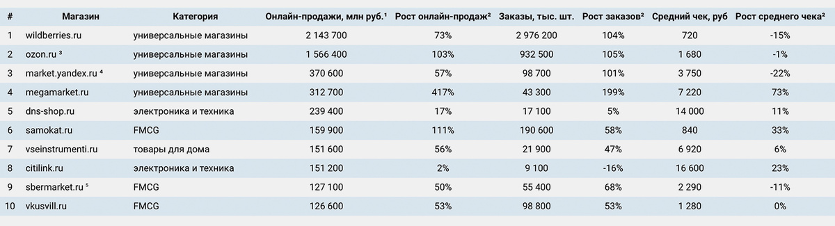 Четыре из десяти верхних строчек занимают маркетплейсы. Больше всего вырос объём продаж у «Мегамаркета» — на 417% в сравнении с прошлым годом. Лидеры рейтинга немного сбавили темпы, но всё равно продолжают расти: Wildberries — на 73%, Ozon — на 103%, «Яндекс Маркет» — на 57%.