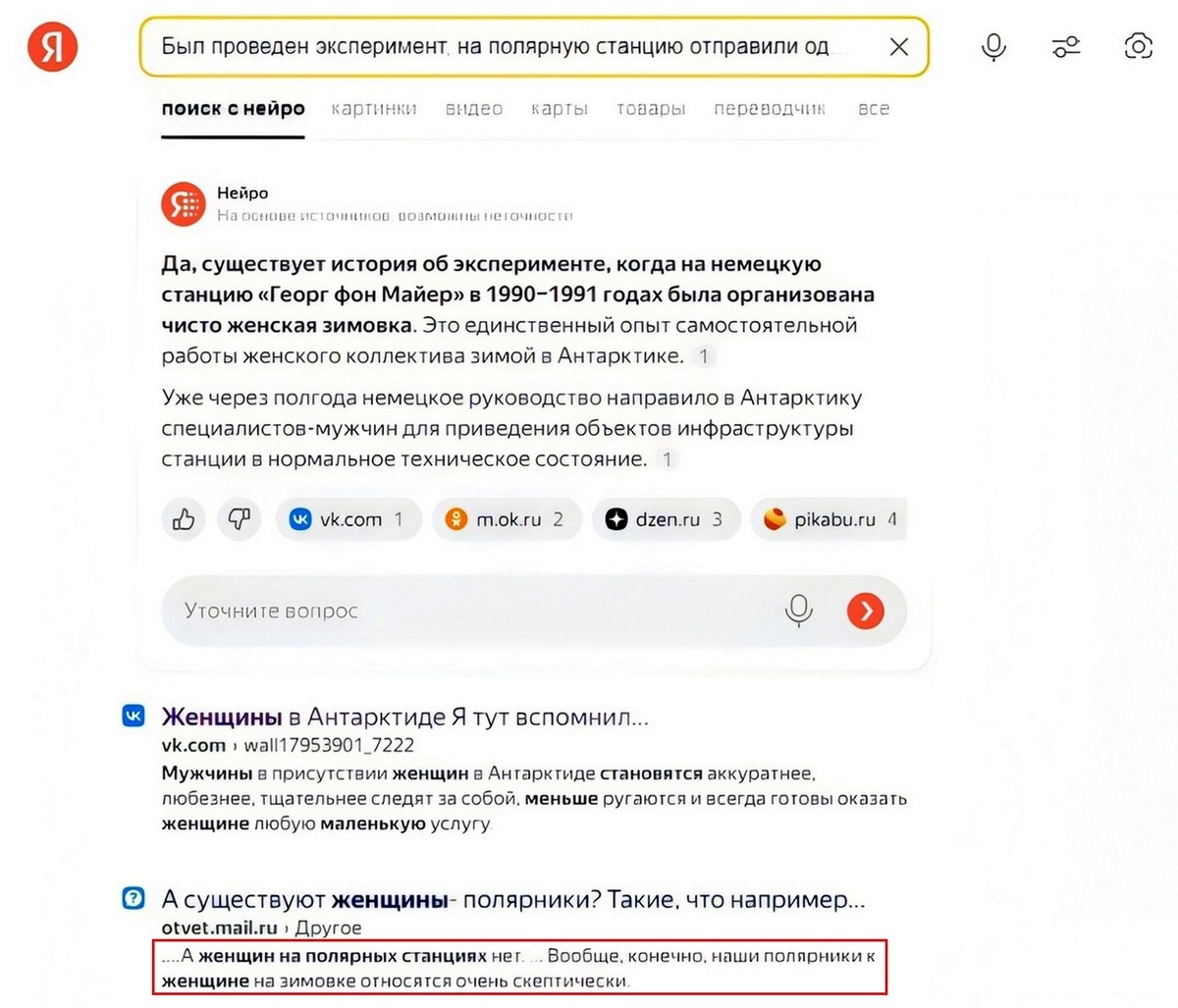 Был проведен эксперимент, на полярную станцию отправили одних женщин. Через полгода или меньше их пришлось заменить мужчинами, потому что оборудование и техника стали ломаться, а отремонтировать они не могут. Вывод - женщина создана для комфортных условий, а мужчина для тяжелых и комфортных, он более универсален... Бабы без мужчин ни на что не способны!Был проведен эксперимент, на полярную станцию отправили одних женщин. Через полгода или меньше их пришлось заменить мужчинами, потому что оборудование и техника стали ломаться, а отремонтировать они не могут. Вывод - женщина создана для комфортных условий, а мужчина для тяжелых и комфортных, он более универсален... Бабы без мужчин ни на что не способны!
