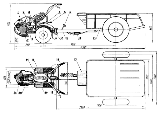 Компоновка мотоблока с прицепом: 1—двигатель (от мотоцикла ММВЗ-3.111); 2 — фильтр воздушный (от ММВЗ-3.111); 3 — катушка зажигания (Б-300); 4 — рычаг управления реверс-редуктором; 5 — рычаг управления коробкой передач двигателя; 6 — педаль тормоза; 7 — глушитель (от мотопомпы MII-800); 8 —рама мотоблока; 9 — щиток грязевой; 10 — узел шарнирный; 11 —рама грузовой тележки; 12 — цилиндр тормозной; 13 —кузов грузовой тележки; 14 — коммутатор электронный (КЭТ-1А); 15 — бак топливный (от мопеда «Рига-12»); 16 — ручка «газа»; 17 — сиденье водителя; 18 —рычаг сцепления; 19 — крыло; 20 — фиксатор рычага запуска двигателя, резиновый; 21 — рычаг запуска двигателя.