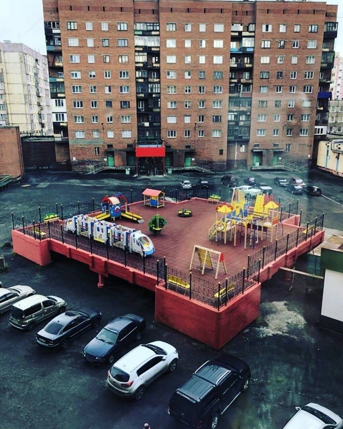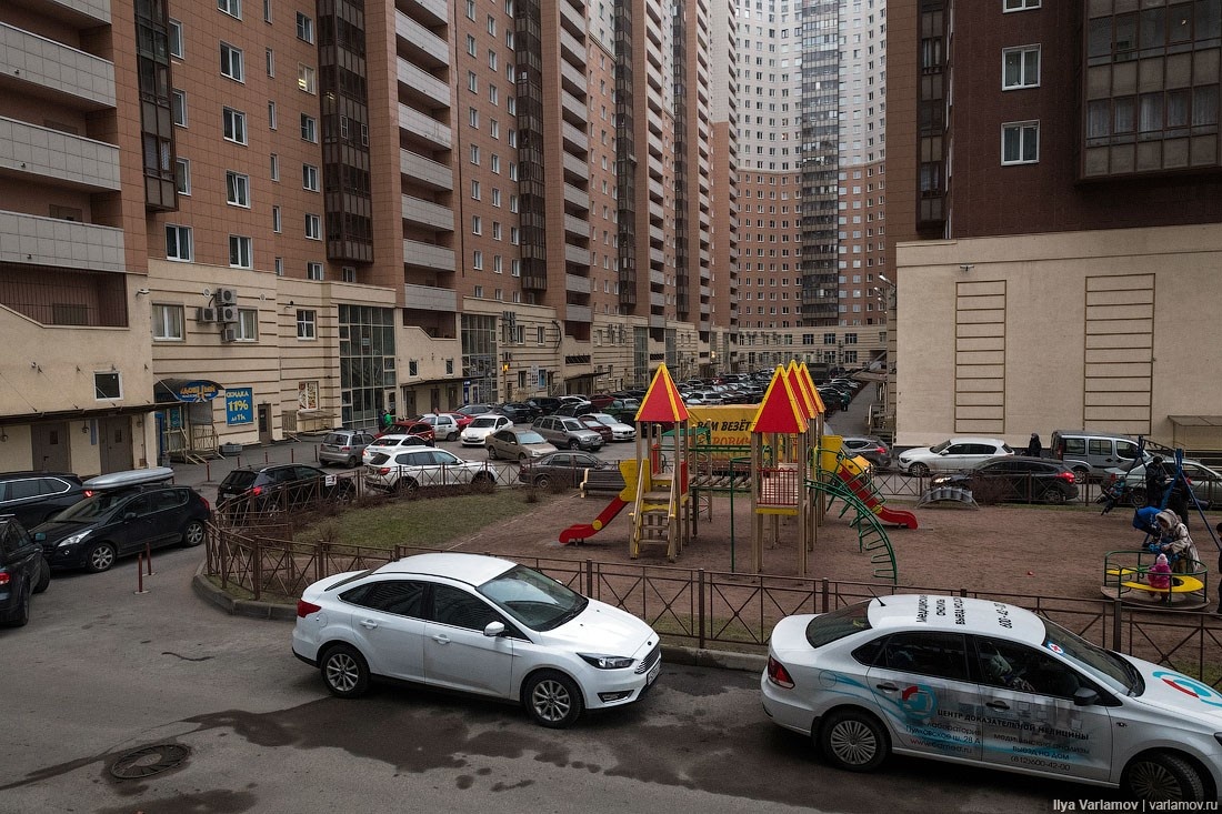 Детская площадка в таком дворе обычно есть, но лишь потому, что застройщик вынужден её делать по нормативу. Если бы норматива не было, он бы игнорировал это досадное недоразумение. Сама детская площадка обычно представляет собой низкокачественный цветастый городок, но сейчас не об этом. Проблема в том, что в такой двор маленького ребёнка нельзя спокойно отпустить погулять. Когда детская площадка находится посреди парковочного поля, ребёнок не может играть самостоятельно: это просто опасно.