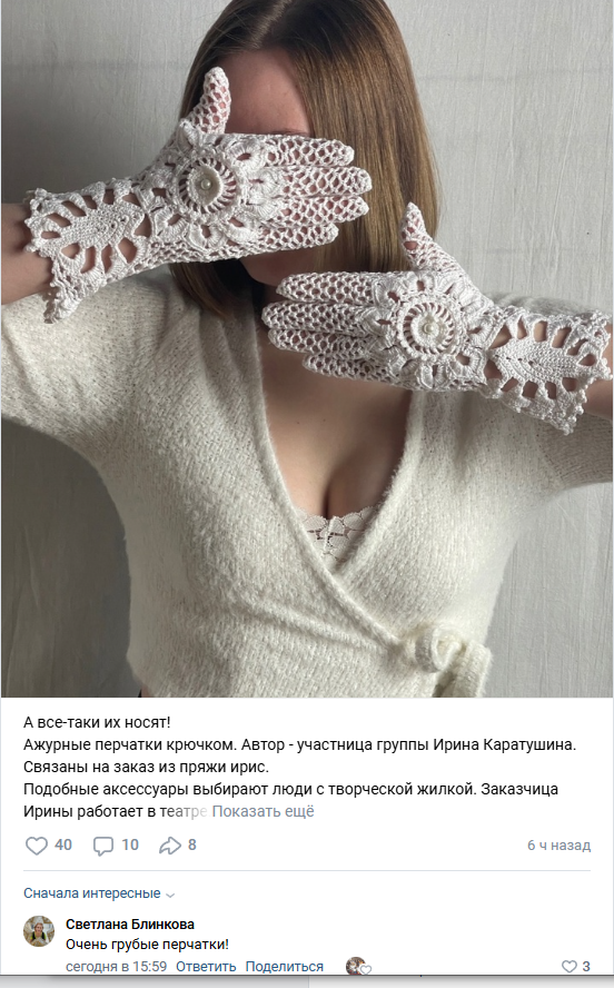 В моей большой группе в контакте мастерица Ирина Каратушина показала интересную авторскую модель перчаток. В комментариях их забраковали, сказали, что слишком грубые. НО! Нельзя оценивать аксессуар вне образа. Важны и человек, который их будет носить, и одежда, образ в целом. Мягкая кофточка на запах с этими перчатками не сочетается, согласна. К сожалению, у мастера зачастую нет возможности сделать профессиональное фото своего изделия в полном образе. На модели и в подходящей одежде. А заказчицы не спешат делиться своими фото. У меня только одна заказчица показала свои образы с ретро перчатками. Попозже покажу. А данные перчатки могут быть единственным акцентом в комплекте с платьем из льна, например. Или из джинсы. Есть в них что-то королевское. И одновременно деревенское, из натурального стиля. И можно найти или сшить платье, которое сочетает в себе оба этих стиля. Будет неожиданно и интересно. Нашла несколько ассоциаций в пинтерест, листайте галерею. Минималистичный платье может слу
