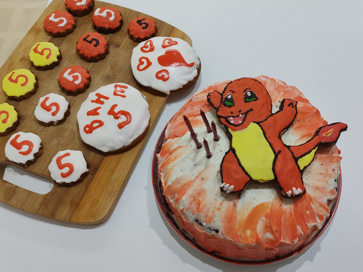 У меня уже есть две публикации с идеями по оформлению тортов: В этой статье я расскажу, как украшала торт для сына. Фотографий процесса у меня нет. Только результат. Но я опишу суть. После того, как я дочке сделала торт-пикачу, сын сразу стал просить на свой день рождения торт с его любимым покемоном - Чармандером. Полистав варианты из интернета я решила, что торт в форме этого существа мне не нравится и лучше сделать отдельного пряничного Чармандера. Я распечатала трафарет, по нему вырезала из теста силуэт (остатки теста пустила на маленькие печеньки-пряники). Раскрасила покемона цветной глазурью. Изначально планировала торт оформить в белом цвете. Но потом пришла идея упростить задачу и не выравнивать его. Часть крема я оставила белым, часть покрасила в оранжевый. Покрыла торт белой основой, а затем добавляла оранжевую часть крема, размазывая её тыльной стороной чайной ложки, чтобы создать эффект огня. Чармандер дышит огнём. Поэтому я расположила свечки на уровне его рта. В итоге при