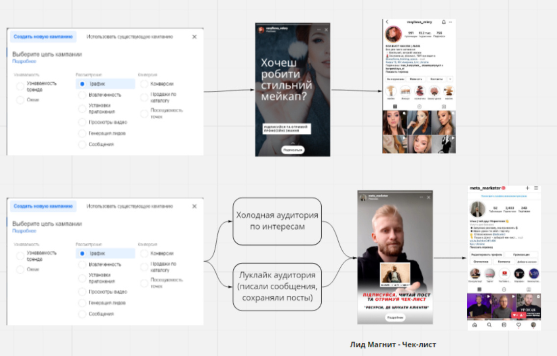 Я описал основные рекламные связки, которые приносят результат. Информация подготовлена больше для новичков, чтобы понять саму структуру запуска рекламы. Но если у тебя уже есть опыт, думаю, тоже будет полезно. Связка подойдет для привлечения целевой аудитории на профиль Instagram с дальнейшим прогревом контентом и монетизацией аудитории. Больше всего подходить для продажи экспертных услуг, обучения, а также недорогих товаров. Данная связка универсальна (лендинг можно заменить на каталог для того, чтобы показать ассортимент товаров). Очень хорошо подходит для продажи услуг (в том числе BtoB) и дорогих товаром. Классическая связка с целью "Генерация Лидов" позволит быстро собрать заявки на услуги и сложные товары. Но подтверждаемость в продажу обычно низкая. Поэтому я люблю запускать данную связку на теплую аудиторию, которая уже знает о вашем предложении (ретаргет). Достаточно новая связка с квиз-лендингом показывает хорошие результаты в нише разных услуг и сложных товаров. Неожиданно
