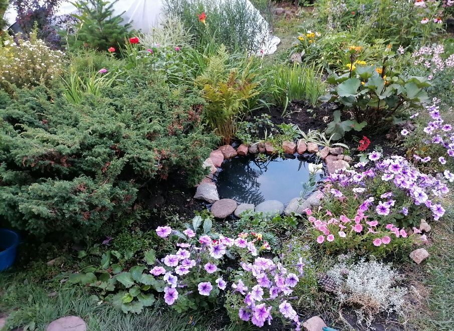 Обязательно! На участке должен быть хоть небольшой водоемчик. Просто я очень люблю воду (я Рыба по гороскопу), люблю плавать. Конечно, в моем прудике на даче не поплаваешь, он совсем крохотный, но так украшает участок. И я сделала его так, что могу любоваться им, сидя за столом у себя в домике через стеклянную дверь, и тем более, сидя на террасе. Прудик совсем маленький, сначала это был небольшой старый бак, вкопанный в землю, но потом он прохудился. И я подумывала – не купить ли мне специальную красиво изогнутую форму под пруд, какие продаются в магазинах. Но места у меня там мало, рядом растет большой куст можжевельника, и уже негде размещать такую емкость. Поэтому я просто расширила яму и застелила ее пленкой. Года через 2 пленка тоже прохудилась и в прошлом году я заменила ее новой. В общем-то это совсем не сложно. Вот не знаю, что будет в этом году. Надеюсь пленка еще будет цела. Этапы сооружения пруда И вот конечный результат На фото показаны разные варианты озеленения моег