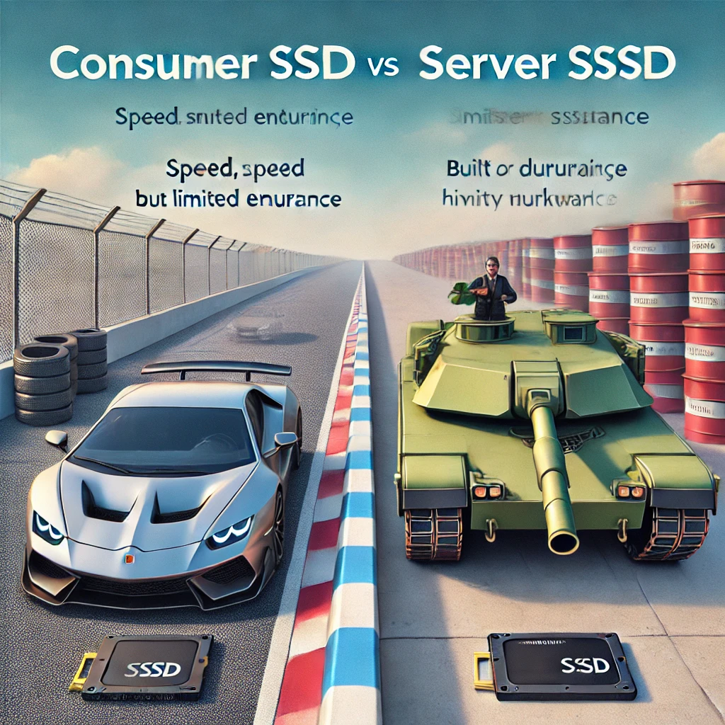 Вы когда-нибудь задумывались, почему одни SSD стоят как пачка доширака, а другие – как подержанный Жигуль? Всё просто: серверные SSD – это броневики, а обычные – городские легковушки. Давайте разберёмся, чем они отличаются и кому что нужно! Обычные потребительские SSD – это как резвая иномарка: быстро стартует, не жрёт топливо (читай – электричество) и радует владельца. Они идеально подходят для загрузки Windows, запуска игр и хранения фоточек с прошлогоднего отпуска. Но не всё так радужно: В общем, если пользоваться аккуратно – хватит надолго, но для тяжёлых задач он слабоват. А теперь представьте мощный тягач, который готов тянуть фуру с базами данных. Это серверный SSD. Он создан для круглосуточного пахоты и вообще не знает, что такое выходные. Вот что его отличает: Короче, этот SSD не боится жизни и готов выдерживать нагрузку, которая обычный диск отправит на пенсию. Зависит от ваших задач: В двух словах: обычный SSD – это юркий хэтчбек, а серверный – фура, которая тащит весь бизн