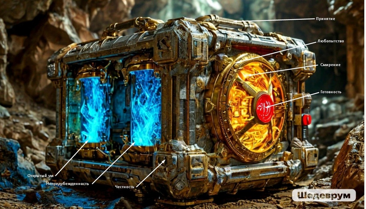 Визуально я представляю себе устройство, корпус которого из титанового сплава «Честности». По бокам расположены две сбалансированные чаши «Открытого ума» и «Непредубежденности». Есть шестеренка «Любопытства», находящаяся постоянно в движении, которая забирает дополнительную энергию из «Смирения». Консоль программирования «Принятий» и кнопка запуска «Готовности».