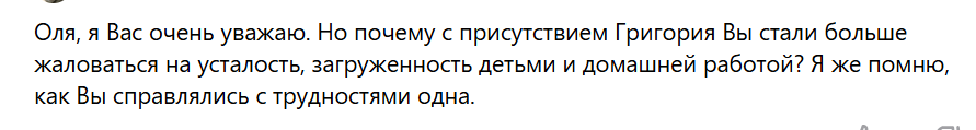 Оля, я Вас очень уважаю. Но почему с присутствием Григория Вы стали больше жаловаться на усталость, загруженность детьми и домашней работой? Я же помню, как Вы справлялись с трудностями одна.