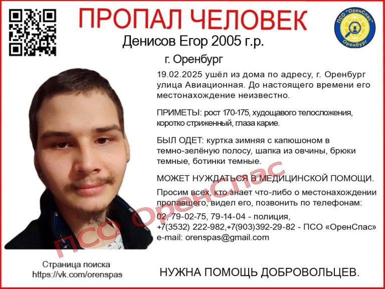Полиция и волонтеры ПСО «ОренСпас» ведут розыск 19-летнего мужчины, который может нуждаться во врачебной помощи. Егор Денисов ушел из дома на улице Авиационной в Оренбурге 19 февраля текущего года. О местонахождении молодого человека до сих пор ничего не известно. ПРИМЕТЫ: рост 170-175, худощавого телосложения, коротко стриженный, глаза карие. БЫЛ ОДЕТ: куртка зимняя с капюшоном в темно-зеленую полосу, шапка из овчины, брюки темные, ботинки темные. Всех, кому что-либо известно о пропавшем, просят позвонить по телефонам: 02, 79-02-75, 79-14-04 — полиция, +7(3532) 222-982,+7(903)392-29-82 — ПСО «ОренСпас». фото: ПСО «ОренСпас»