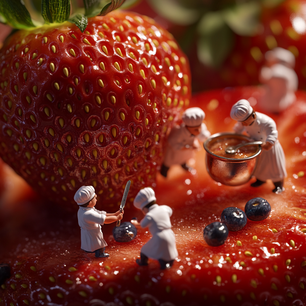 Всё можно сделать в боте syntx 👌🏻 Шаг 1. Написание промта с помощью ChatGPT (SYNTXaiBot >💡GPTs/Claude/Gemini) Мы начинаем с того, что вставляем запрос, где вместо [скобок] описываем сцены, которые хотим увидеть. (Можно сразу описать несколько сцен). Пример запроса в ChatGPT: Создайте креативные промпты, где маленькие человечки [описываете нужные сцены, действия и детали]. Важно, чтобы это была макросъемка, и человечки должны быть чёткими и понятными. Шаг 2. Генерация изображения в MidJourney (SYNTXaiBot > 🎨 Дизайн с ИИ > 🌄 MidJourney) После получения ответа от GPT скопируйте промпт и отправьте его в MidJourney. Пример промпта для MidJourney от ChatGPT: Ultra-detailed macro shot of a fresh, juicy strawberry, where tiny chefs in white hats and aprons are preparing a gourmet meal. One is slicing the strawberry with a minuscule knife, another is stirring a tiny pan of sauce, while a third chef is stacking small blueberries like plates. The fruit's texture is incredibly detailed, with