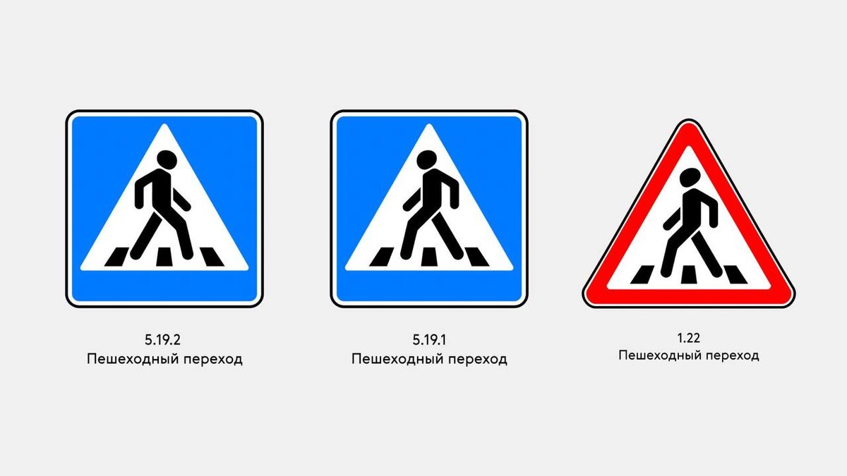 Таким образом, хотя по внешнему виду знаки «Пешеходный переход» 1.22 и 5.19.1-5.19.2 очень схожи, различаются только цветом окантовки и фоном, между ними есть существенная разница.