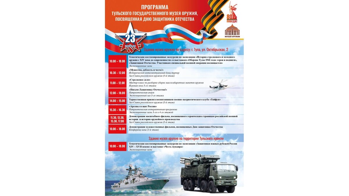 В стенах Тульского государственного музея оружия героическая история нашей страны оживает в каждом экспонате, в эксклюзивном контенте, в рассказах о выдающихся конструкторах-оружейниках и в мультимедийных комплексах. В этом месте можно увидеть всё разнообразие холодного и огнестрельного оружия, которое использовалось российскими воинами с XIV века и до наших дней. Именно с этим оружием они одерживали славные победы, защищая свою Родину. В этот праздничный день в здании-шлеме на интерактивных площадках посетители смогут: — Подержать в руках легендарные образцы российского оружия и принять участие в мастер-классе по стрельбе.
