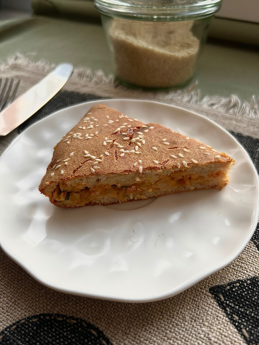 Очень простой и вкусный пирог. Обязательно попробуйте приготовить! Даже не помню откуда этот рецепт, но очень давнишний. Нам понадобятся: Для теста: 2 яйца; 5 ст.л. сметаны; 4 ст.л. муки (у меня альтернативная мука); 1 ч.л. разрыхлителя; 0,5 ч.л. соли, специи. Для начинки: -Капуста, морковь, лук и специи; -Сыр (по рецепту плавленый сыр). Но я беру твердый; -масло для жарки. Капусту потушить обычным способом. (Я обычно тушу больше. Половину убираю в морозильник, чтобы использовать в следующий раз). Даем остыть. Сыр натираем на крупной терке. Далее берем форму (у меня стеклянная, диаметром 22 см.) смазываем маслом и наливаем половину теста. Сверху добавляем капустную начинку и тертый сыр. Заливаем оставшимся тестом и отправляем в духовку. Приятного аппетита!