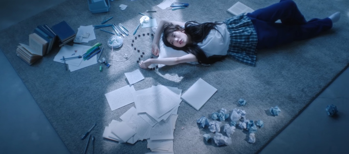 Хочется сделать обзор на что-то простое и доброе. Песня на японском языке. Поэтому здесь опять немного особое настроение. Как я понимаю, группа сделала такой подарок фанатам на 14 февраля. Сложно дарить подарок тому, кого ты любишь, но ты делаешь всё, что в твоих силах. ILLIT. Песня Almond Chocolate. Клип вышел 13 февраля. Сперва наша героиня лежит на полу. Вокруг неё небесный беспорядок. Почему он небесный? В кадре много синего и голубого цвета. Смятые листы и ручки, другие вещи в оттенках синего. Девушка, опираясь на мягкую подушку, что-то пишет, может сочиняет стих, а может письмо кому-то. При этом она слушает музыку. А возле неё лежит сердце, сделанное из конфет, которые девушка время от времени ест. Другая девушка держит в руках фотоаппарат. Она делает фото жёлтого яблока, лежащего на подоконнике. А потом она делает пару своих фото. Чтобы положит негатив в кулон. Кстати, на фотоаппарате, кажется, плюшевый дракон. Следующая девушка, кажется, что-то мастерит, наматывая себе на паль