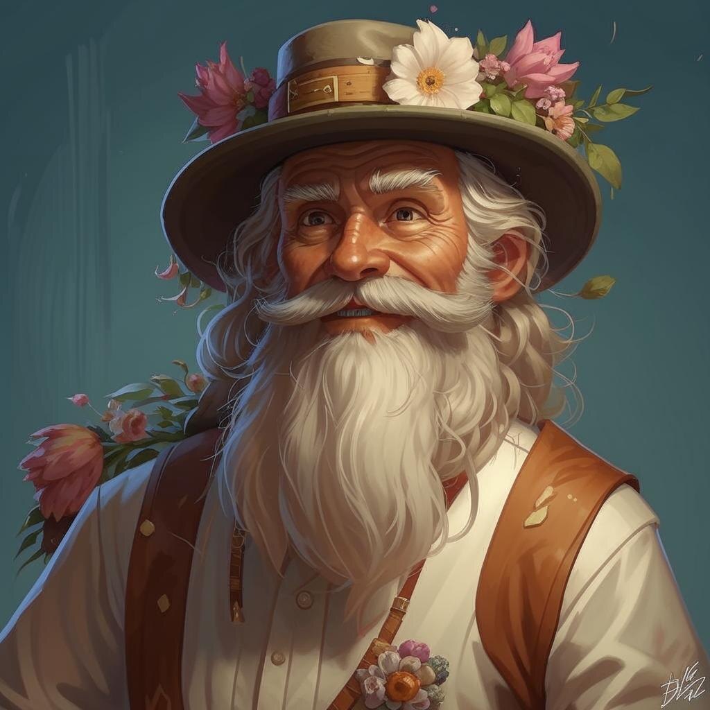 На дедульке были надеты широкие шаровары в клетку, державшиеся только на одной лямке. Вторую, оторванную, чтобы не мешалась, дед заткнул за пояс. Серая рубашка с двумя заплатами и соломенная шляпа с кокетливой ромашкой сбоку дополняли его уютный образ. Цветочки меня так умилили, что я перестала трястись, успокоилась и протянула ему расчёску.