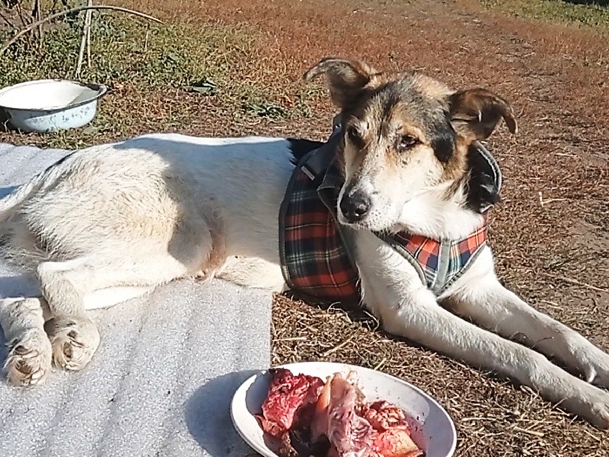 И Степан пошёл… 🎉 Через 5 месяцев невероятных усилий – его и наших. Сказать, что нам всем было тяжело, значит ничего не сказать. При моём весе в 50 кг таскать крупную собаку, пусть и худую – нелегко. 🏋️♀️ В туалет он, конечно, ходил под себя 💩. У нас появился запас разных пенок, шампуней, средств по уходу за лежачими, чтобы отмывать его. Рот у него почти не открывался 🤐, поэтому кормили маленькими кусочками, и в рот засовывать нужно было самим. Жидкую пищу он не ел, язык его не слушался, даже пить ему было тяжело. 💧 Любое движение причиняло ему боль 😫, порой приходилось завязывать ему рот, чтобы вытащить на улицу погулять. Погулять означало – полежать на покрывале с подушкой под головой. 😴 Но даже в этом состоянии у него во взгляде читалась воля к жизни! 💪 Он наблюдал, как наши собаки бегают по участку, играют, и даже старался двигать головой и лапами, чтобы следить за ними. 👀 Первые разы мы ставили его на ноги только втроём – двое должны были держать его, а третий – выпрямлять и ставить лапы, так как лапы деревенели и заворачивались. Потом наш спонсор оплатила нам ходунки, и мы начали водить его уже по одному. 🚶 3-4 часа прогулок в день, когда приходишь домой, рук уже не чувствуешь 😩. Держать всё это время на весу пусть и худое, но крупное тело Степы – сравнимо для меня с занятием со штангой. А Степан после прогулок вырубался и храпел 😴, как будто он пробежал 100 км.