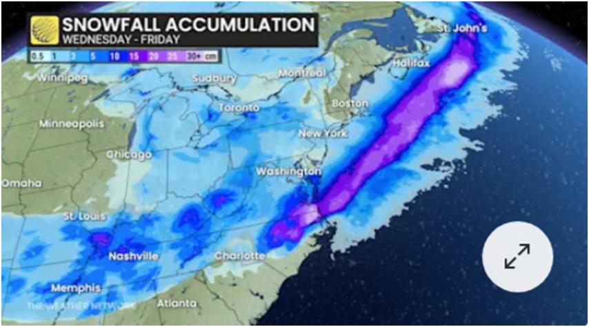 Необычная зима в США продолжается на Восточном побережье, и даже побережье Мексиканского (Мериканского) залива к югу от Американско – Канадской границы, так в среду на восточном побережье США прошёл сильный снегопад. В Норфолке, штат Вирджиния, со среды по четверг выпало 29,2 см снега. В среду выпало 26,7 см количества снега, что стало пятым по величине снегопадом за один день в истории города. Это тот же самый шторм, который в пятницу принес снежную бурю в некоторых районах Атлантической Канады. Это последнее "ура" Ла-Нинье? Хотя как Ла-Нинья может влиять на Восточное побережье США. К весне этого года эта закономерность может исчезнуть из новостной информации. Из-за мощной системы низкого давления, развивающейся у Восточного побережья США, которая была, по-видимому, опять рукотворной, из-за вновь наблюдаемой из космоса цепочки мелких торнадо-циклонов, что привело к сильной конденсации влажного воздуха Атлантики, благодаря проходящему рядом течению Гольфстрим. Что не прошло две н