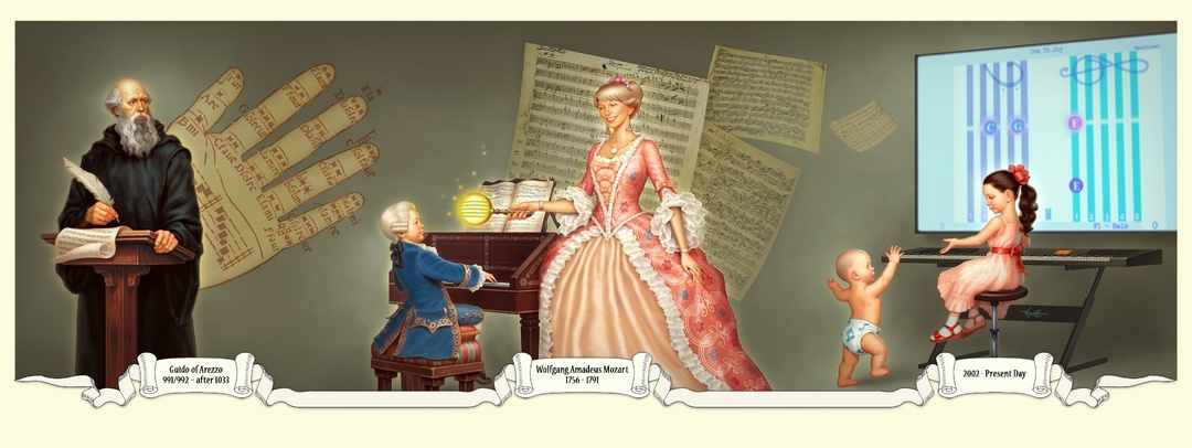 Музыкальная нотация, которой мы пользуемся сегодня, была разработана в XI веке христианским монахом Гвидо Аретинским. Это исторический факт, который не подразумевает религиозного предпочтения, а лишь подчеркивает культурный и образовательный контекст того времени. Подобно тому, как современные цифры имеют арабское происхождение, а многие математические принципы были развиты в Древней Греции, система нотной грамоты возникла в стенах монастырей средневековой Европы, где музыка играла ключевую роль в передаче знаний. Понимание этих исторических реалий помогает нам глубже осознать эволюцию музыкального образования и его научные основы, не привязывая их к каким-либо религиозным убеждениям. Что значит Soft Way to Mozart®? Мягкий (компьютерный) путь к Моцарту - это призыв исправить ошибку прошлого, мысленное путешествие во времени, чтобы возобновить основы исходного кода музыкальной системы Гвидо Аретинского и спасти будущее музыки, культуры и человечества. В чём состоит ошибка и при чём тут