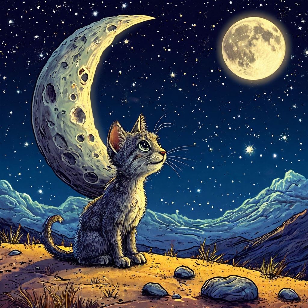 Жил-был в маленькой деревне пушистый кот по имени Мурзик. Он был необычным котом: его шерстка переливалась, как серебро, а глаза светились, как два маленьких месяца. Мурзик любил гулять по ночам, когда все вокруг затихало, и звёзды начинали свой танец на небе. Однажды ночью, когда луна была особенно яркой, Мурзик отправился на свою обычную прогулку. Вдруг он заметил, что от луны к земле тянется тонкая серебристая нить, словно дорожка. Любопытство взяло верх, и Мурзик решил пройти по этой нити. К его удивлению, она оказалась прочной, и он легко поднялся вверх, к самой луне. На луне Мурзик обнаружил целый мир, полный чудес. Там росли серебряные деревья, текли молочные реки, а по небу летали светящиеся рыбки. Но больше всего его поразила старая мудрая сова, которая сидела на ветке самого высокого дерева. — Кто ты, маленький путешественник? — спросила сова, глядя на Мурзика своими огромными глазами. — Я Мурзик, кот из деревни, — ответил он. — А что это за место? — Это Луна, — сказа