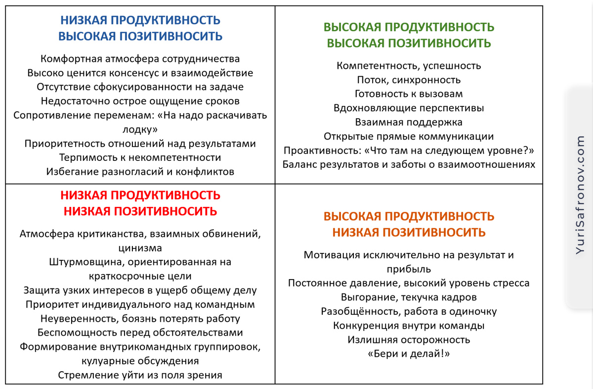 Факторы продуктивности и позитивности определяют эффективность и результативность совместной деятельности команды. Начало здесь. Фокус большинства компаний только на факторах продуктивности. Доминирующая идея в картине мира собственника, в этом случае, то, что бизнес – это система, которая должна добиваться большего меньшими усилиями. Создаются высокоэффективные системы управления, в которых не остаётся места живому и человеческому. Как следствие – давление, тревога, выгорание, текучка, низкая вовлечённость, дополнительные ресурсы на найм и адаптацию, отсутствие психологической безопасности и доверия. Могут ли быть такие организации успешными? Да, могут! И в истории есть много примеров очень успешных компаний с таким подходом к управлению. Будут ли в таких организациях хотеть работать самодостаточные личности? Скорее нет. И моя практика показывает несовместимость таких людей с такими компаниями. Они либо вообще не приходят в такие компании, либо очень быстро самостоятельно уходят