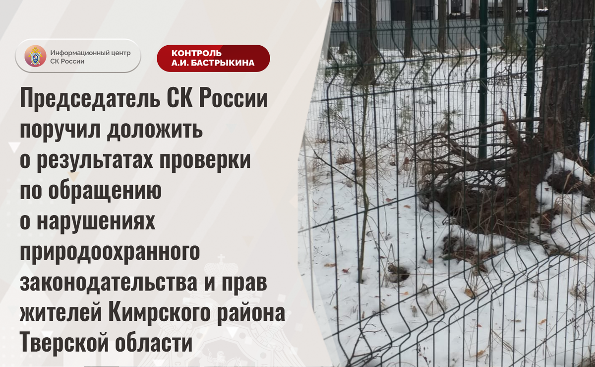 Председатель СК России поручил доложить о результатах проверки по обращению о нарушениях природоохранного законодательства и прав жителей Кимрского района Тверской области В комментариях в телеграм-канале Информационного центра СК России размещено обращение по вопросу нарушения природоохранного законодательства и прав жителей Кимрского района Тверской области. В 2005 году земельные участки, расположенные в прибрежной зоне р. Волги, были переданы в частную собственность. Впоследствии владельцы земли, с целью возведения гостиничных комплексов и иных коммерческих объектов, установили по границам участков заборы, ограничив доступ местных жителей к водоему. Кроме того, в ходе строительных работ были уничтожены зеленые насаждения, в том числе вековые сосны в границах Мыльцевского бора. Многочисленные обращения граждан результатов не принесли. Указанная ситуация получила распространение в социальной сети. В СУ СК России по Тверской области по доводам, изложенным в комментарии, начата процесс