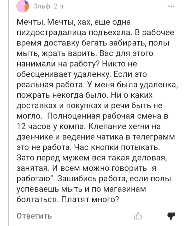 Всё -таки таких людей должны знать. Пусть не в лицо, но они действительно существуют. Вот такие токсичные люди, которые бегут на женские каналы и пишут...своё мнение. Куда же без него? Работаешь из дома? Безработная. Успеваешь работать, готовить, полы мыть, за детьми смотреть? Да ты обманщица. Как на этом можно зарабатывать? Да и что ты там получаешь? Конечно, переубеждать таких товарищей никто не собирается. Потому что это бесполезно. Да и зачем тратить своё время? Заблокировала и нет проблем. Понятно, что не все люди нам нравятся. Это нормально. Только вежливые люди выражают свое мнение не брызгами яда. Не нравится и вовсе мимо пройдут. Меня вдохновляют другие люди. Те, которые несмотря ни на что работают или ищут удобные способы заработка, исходя из личных обстоятельств. Находят и зарабатывают. Пусть сначала немного. Профессий сейчас много: выбирай не хочу. Обесценить можно всё и всегда. Только зачем? Завидуют, что другие могут, а они нет? Или это просто способ слить негатив? Да
