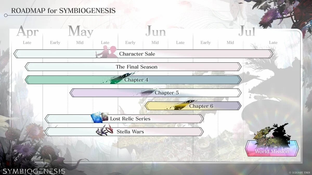 Square Enix объявила, что NFT-проект Symbiogenesis подходит к концу, и поделилась финальной дорожной картой, которая охватывает последний сезон вплоть до выхода финальной мировой миссии в июле 2025 года. В нем отмечается, что в это время появятся три последние главы, а также компонент «Звездные войны» (Stella Wars), в котором фракции будут противостоять друг другу. В инфографике, посвященной окончанию Symbiogenesis, говорится о последней продаже персонажей для NFT-проекта Square Enix, трех последних главах, грядущей серии Lost Relic, функции Stella Wars и мировой миссии, которая завершает все. Согласно визуалу, продажа персонажей закончится в конце июля 2025 года. Пятая глава начнется в середине мая 2025 года, а шестая — в середине июня 2025 года. Финальный сезон в целом завершится в середине июля 2025 года. Что касается серий Lost Relic и Stella Wars, то они, по сути, будут длиться два месяца. Каждый из них начнется в мае 2025 года, а закончится сразу после июня 2025 года. В Stella Wa