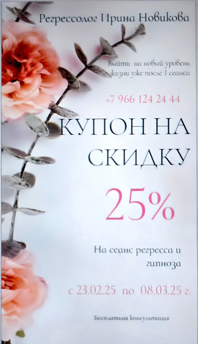 Сердечно поздравляю мужчин с наступающим праздником и хочу Вам подарить сертификат на услуги регресса и гипнотерапии, для вас и вашей лучшей половины на Международный женский день! Этот необычный подарок – возможность открыть новые грани вашего внутреннего мира и укрепить связь с любимой женщиной. Вместе вы сможете исследовать прошлые опыты, избавиться от блоков и страхов, а также гармонизировать ваши отношения. Представьте: глубокое расслабление, освобождение от негативных эмоций и новое понимание себя и партнера. Регресс и гипнотерапия – это инструменты, позволяющие бережно и безопасно погрузиться в подсознание и найти ответы на волнующие вопросы. Сертификат действителен на сеанс регресса и гипнотерапии, который поможет вам и вашей половинке обрести гармонию, счастье и взаимопонимание. Подарите себе возможность перезагрузки и начните весну с обновленной энергией и любовью! Свяжитесь со мной для записи на удобное время. https://regressolog24.ru/- сайт https://forum.regressolog24.ru/ -