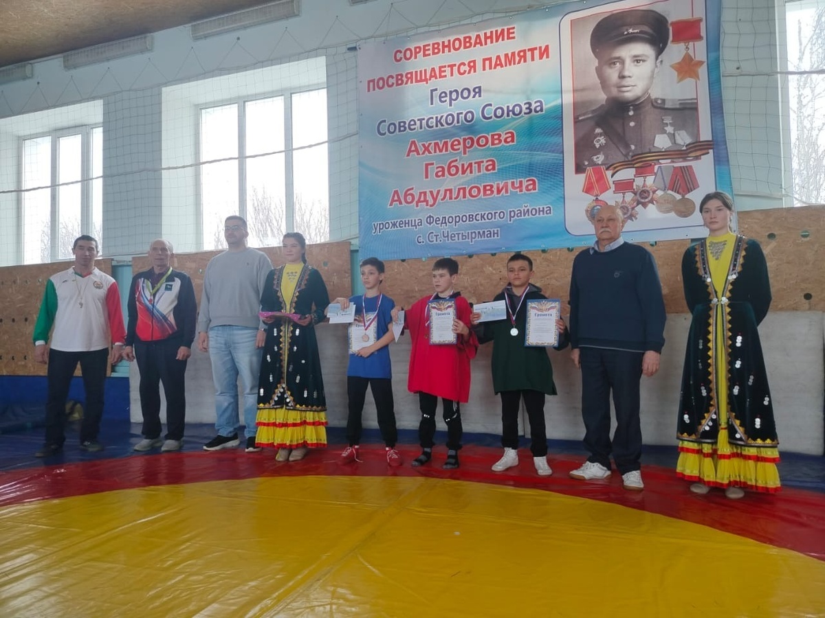 В селе Бала-Четырман Федоровского района прошёл открытый турнир по борьбе корэш памяти Героя Советского Союза Ахмерова Габита Абдулловича Спортивное мероприятие посвятили Дню защитника Отечества, Году поддержки участников СВО и членов их семей. Куюргазинскиий район представили воспитанники ДЮСШ под руководством тренера-преподавателя Румиля Амировича Гайсина. Наши ребята показали красивую и зрелищную борьбу. По итогам турнира третье место занял Бикмухаметов Данияр, вторым стал Келов Ильяс и победу в своей весовой категории завоевал Алсынбаев Алим. Победители и призеры награждены почётными грамотами, медалями и ценными призами. Поздравляем! Дмитрий Балянов