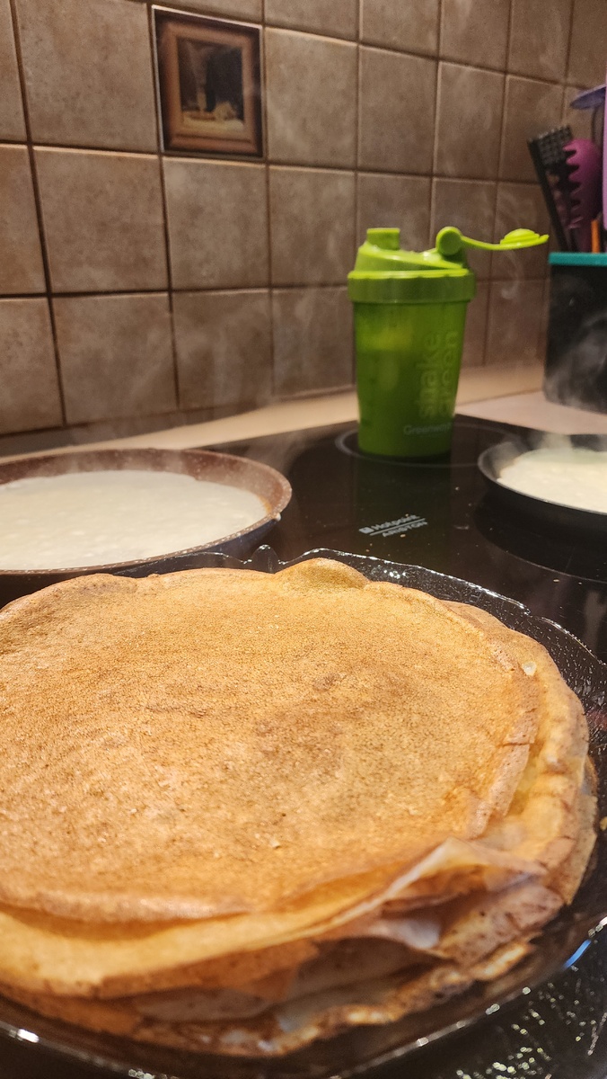 Когда мне не спится утром в выходные, я иду жарить блины . И сегодня пару советов от меня . Жарить блины лучше сразу на 2 сковородах. Если вы не хотите час стоять у плиты. Это реально сокращает время. Наливать тесто на сковороду удобнее из шейкера, чем из половника. Поэтому я всего готовлю тесто в блендере, а потом переливаю в шейкер. Можно и в шейкере тесто приготовить. Но это если вам надо мало блинчиков, в среднем на 10 блинов хватает ,если шейкер 500мл. Ну и вот вам мой рецепт : 600мл молока 2 яйца 12ст.л.муки 1ст.л. сливочного масла 2ст.л. сахара щепотка соли 100мл кипятка В блендер наливаю молоко, добавляю яйца, соль, сахар, половину муки и взбиваю. Как мука размешалась добавляю вторую половину и масло сливочное, предварительно растопленное. Перемешиваю, добавляю кипяток. Наливаю в блендер тесто и готовлю . Сковороду не смазываю. Хватает на 2 шейкера . Около 20 блинов выходит.