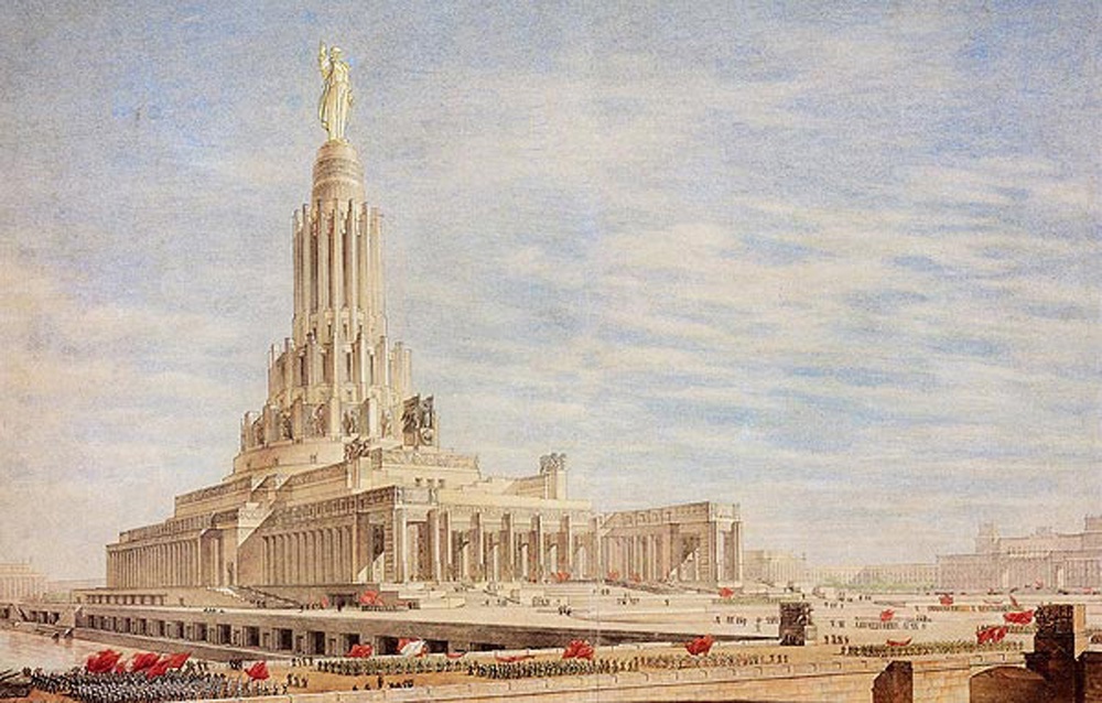 Одним из наиболее ярких примеров восприятия и замещения религиозной архитектуры и символики на советскую является разрушение в 1934 году храма Христа Спасителя в Москве и планы строительства на его месте грандиозного Дворца Советов. Подобное совпадение отнюдь не случайно. Дворец мыслился как «символ великих побед сталинской эпохи, олицетворение мощи и величия нашей страны, победоносно идущей под знаменем Ленина-Сталина к коммунизму». Архитектура, живопись, скульптура Дворца должны были образовывать духовное пространство, в которое будут вовлекаться массы людей для участия в советском «богослужении». Пышностью и размерами этот дворец должен был многократно превосходить и снесенный храм, и самые знаменитые соборы Европы. Внутреннее убранство предполагаемого Дворца Советов всецело совпадало с тем, что окружало верующих в соборах. В плафонах и картинах должен был предстать наглядный рассказ, воспроизводящий центральные эпизоды так называемого советского «священного писания» от ВКП(б), то есть «Краткого курса истории партии» – тщательно разработанную советскую мифологию. Дворец Советов задумывался чем-то вроде постамента памятника Ленину, обретшего в сталинской мифологии своеобразный статус «божественной ипостаси». Поднятая на огромную высоту колоссальная 15-метровая фигура должна была быть значительную часть времени скрыта облаками, и, освобождаясь от облаков, выступала бы в озарении солнца подлинным сошествием Ленина «с небес». Прообразом для этого монумента могли послужить разве что ассирийские и древнеегипетские колоссы с ликами божественных фараонов и царей.