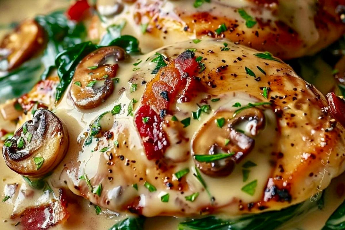 Задушенная курица со сливками, шпинатом, беконом и грибами – ароматное блюдо с насыщенным вкусом