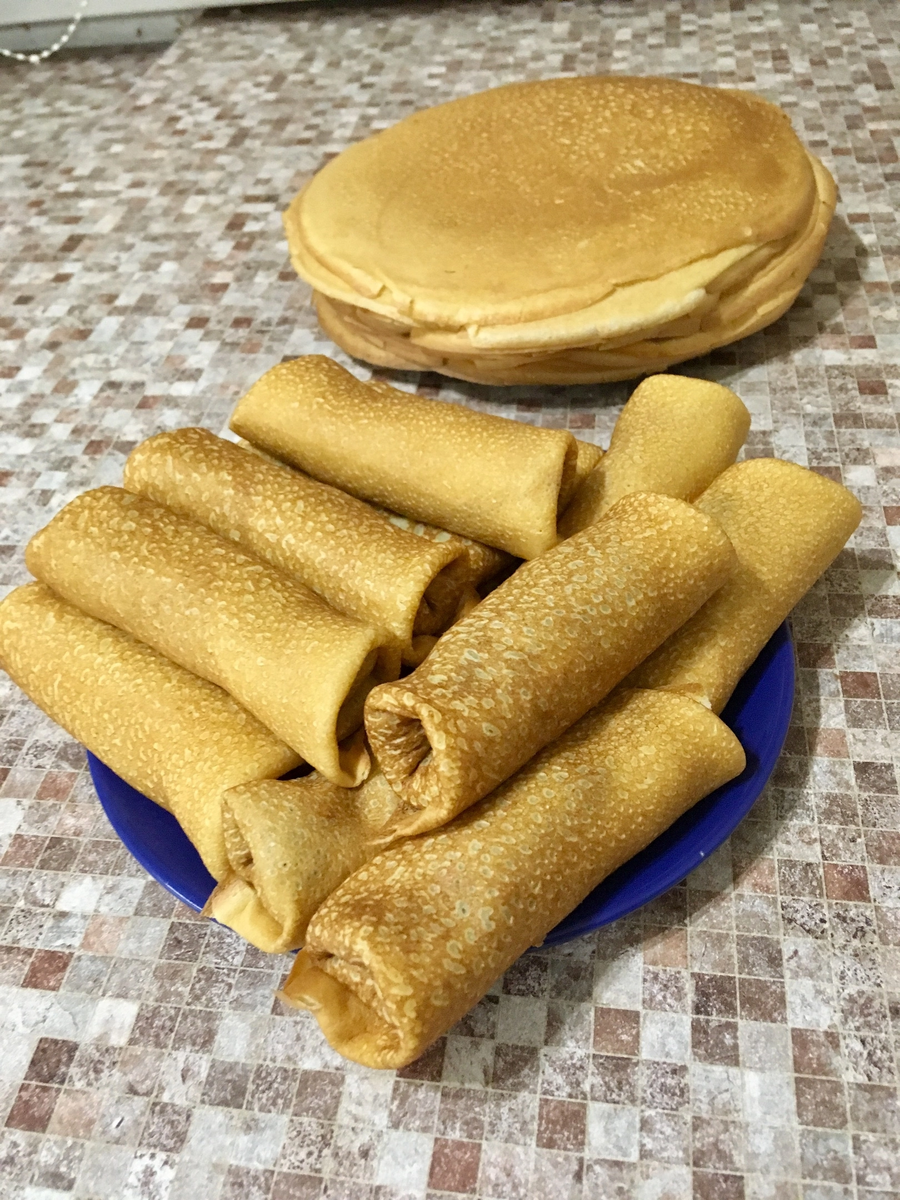Блины на кипятке Понадобятся следующие ингредиенты: 0,7 литра молока жирность 2,5% 5 яиц отборной или 1 категории 1 чайная ложка с небольшой горкой (7 гр) соли 2 столовые ложки (30 гр) сахара 350-400 гр муки 300 мл кипятка 2 столовые ложки 🥄 ( 30 мл )растительного масла Рецепт: Готовые блины на кипятке подавать в теплом виде со сметаной или любыми другими добавками на ваш вкус. У меня блины с мясом. Можно сделать с ветчиной и сыром, можно с творогом. Можно замешивать ручным или планетарным миксером PS. Если планируете в блины не сладкую начинку, норму сахара можно уменьшить вдвое.